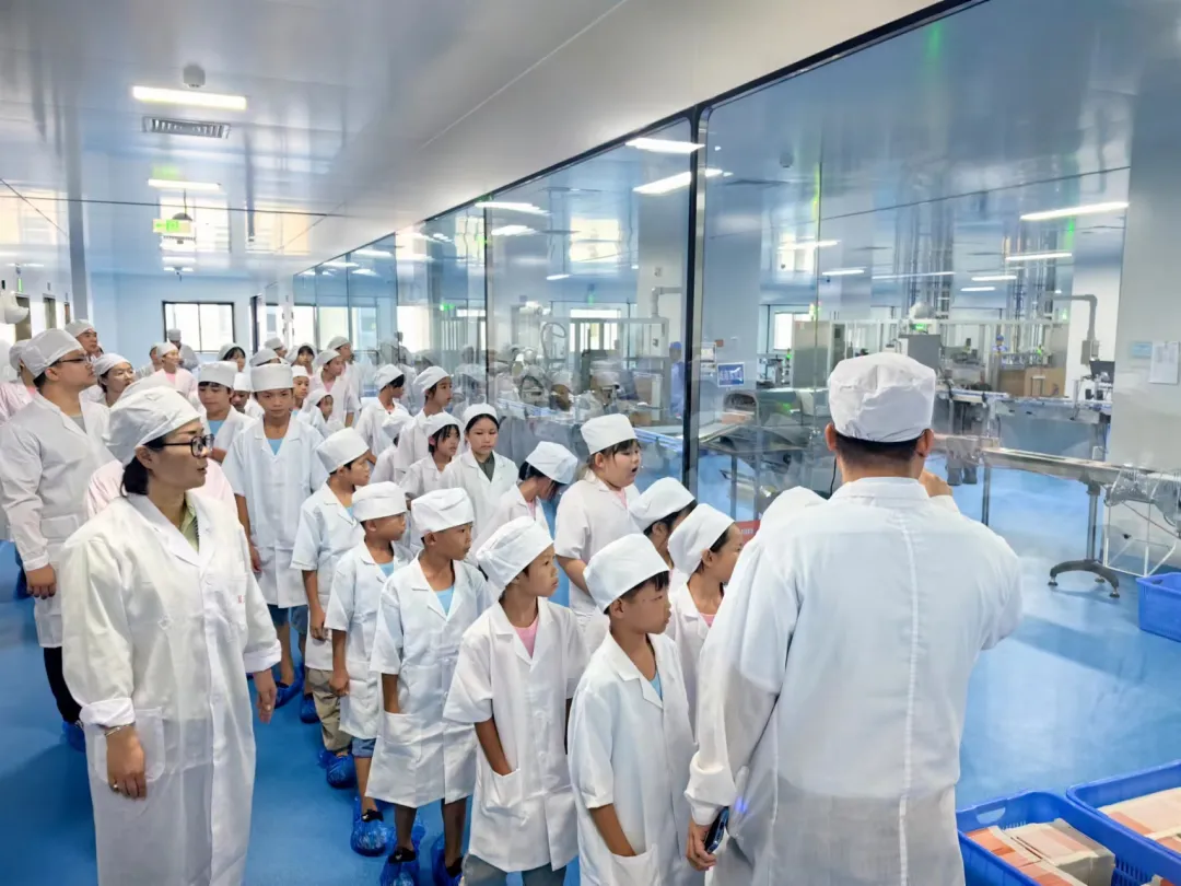 穿戴好白大褂、防护帽和防护鞋套后,孩子们兴奋地踏入了智能绿色工厂。他们亲眼目睹了先进的制药设备如何高效、精准地完成药品生产,纷纷发出惊叹声。了解了生产线的自动化、智能化特点,以及这些技术如何提升药品质量和生产效率。孩子们听得认真,还不时提出自己的问题,与讲解员进行互动。